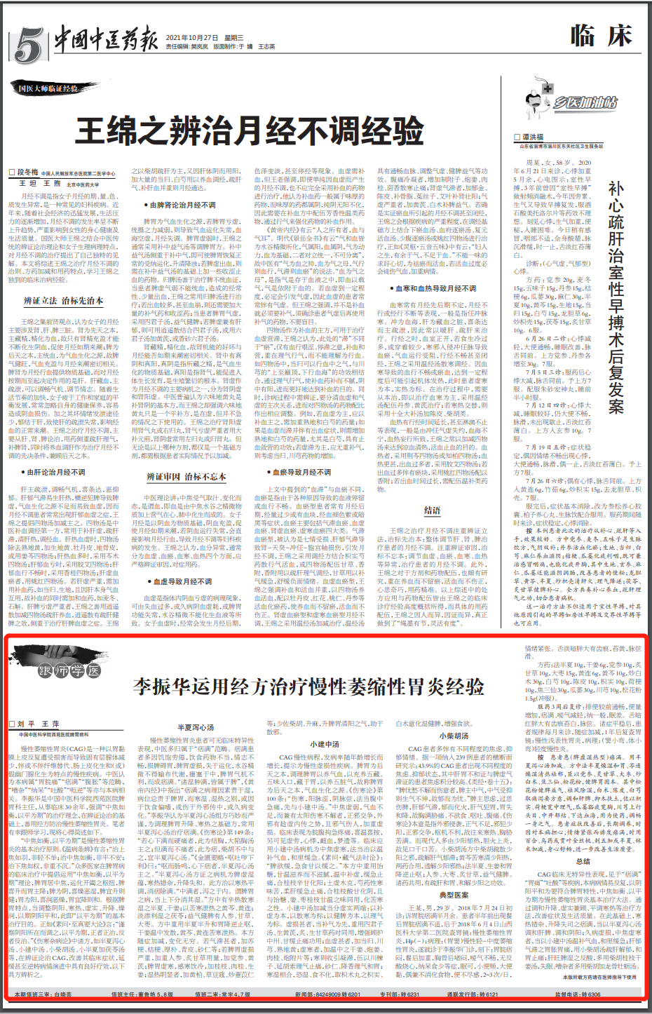慢性萎缩性胃炎是一种以胃黏膜上皮反复遭受损害而导致固有层腺体减少,伴或不伴纤维替代、肠上皮化生和(或)假幽门腺化生为特点的慢性疾病。中医认为本病属“胃脘痛”“痞满”“腹胀”等范畴,“嘈杂”“纳呆”“吐酸”“呃逆”等亦与本病相关。
