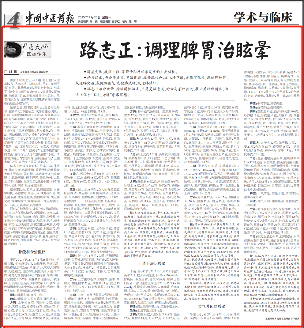 路志正,首届国医大师,中国中医科学院主任医师。路老总结提出了“持中央,运四旁,怡情志,调升降,顾润燥,纳化常”的16字调理脾胃学术思想。现将其运用调理脾胃法治疗眩晕的经验介绍如下,以飨同仁。 • 脾虚失运、痰湿中阻、蒙蔽清阳乃眩晕发生的主要病机。 • 治疗眩晕,当分清虚实,灵活化裁,或补疏相合,或上清下滋,或燥湿化痰,或健脾和胃,或运脾化湿,或健脾益气,或健脾疏肝,或运脾镇肝。 • 路志正治疗眩晕,辨治圆机活法,用药灵活老道,时方与茶饮共进,扶正并祛邪同施,治法上倡导“王道、老道”学术思想。 眩晕之证,轻者闭目即止,重者如坐舟车,旋转不定,不能站立,或伴有恶心、呕吐、汗出,甚则昏倒等症状。《素问·至真要大论篇》有“诸风掉眩,皆属于肝”之论;《灵枢·口问》有“上气不足”之说;《灵枢·海论》更有“髓海不足”之言;《素问·玄机原病式·五运主病》云:“风火皆属阳,多为兼化,阳主乎动,两动相博,则为之旋转”;《丹溪心法·头眩》则偏主于痰,更有“无痰不作眩”之论,并提出当“治痰为先”。《景岳全书·眩晕》指出:“眩晕一证,虚者居其八九,而兼火、兼痰者不过十中一二耳”,强调了“无虚不能作眩”的理论,在治疗上认为“当以治虚”为主。李东垣则提出“内伤脾胃,百病由生”及“土壅木郁”之说,在治疗上倡导“木郁达之”。 路志正比较推崇东垣、丹溪之学,他认为:脾虚失运、痰湿中阻、蒙蔽清阳乃眩晕发生的主要病机,同时指出本病发生多由嗜食肥甘、饥饱劳倦,伤于脾胃,健运失司,以致水谷不化精微,湿聚生痰,痰湿中阻,则清阳不升,浊阴不降,从而导致眩晕。 路志正认为,眩晕之证,病情复杂,当详审病机,分清虚实,灵活化裁,或补疏相合,或上清下滋,或燥湿化痰,或健脾和胃,或运脾化湿,或健脾益气,或健脾疏肝,或运脾镇肝,不一而足,证虽顽固,药亦能医。 同时,在健脾益气,燥湿化痰,升清降浊之余,亦应结合具体情况,审因辨证,合理加减,如肝阳上亢者,加天麻、钩藤、僵蚕、炒蒺藜、生龙骨、生牡蛎;气郁明显者,加苏梗、佛手、荷叶梗、枳实;心烦失眠者,加夜交藤、合欢皮、炒枣仁、柏子仁、珍珠母;肝郁明显者,加桂白芍、炒蒺藜、绿萼梅、玫瑰花;湿热明显者,加五爪龙、功劳叶;阴虚明显者,加南沙参、麦冬、五味子;胆火上扰者,加胆南星、竹茹、黄连。兹举验案,说明如下。 补疏相合清湿热 王某,女,时年70岁,2014年2月25日初诊。头晕头胀,视物旋转数月,如做舟车,不能引动,视物模糊,耳鸣如蝉,头痛,乏力,气短,咽痒咳嗽,无痰,纳差,食欲不振,脘腹胀满,大便1日2次,努责无力,便后不爽,双膝疼痛,尿频不畅,子宫脱垂于外7年,夜寐梦多,面目及下肢浮肿,上半身汗出,足冷,时时欲寐,口干欲饮,面色黧黑晦滞,双目无神,体形适中,舌黯红,胖大有齿痕,苔薄黄微腻,脉滑数尺弱。 辨证:脾虚失运,痰浊中阻。 治法:健脾益气,养血柔肝,燥湿祛痰。 方药:太子参15克,南沙参12克,僵蚕10克,天麻12克,枇杷叶12克,胆星8克,竹茹12克,浙贝母10克,炒苍术12克,炒白术10克,炒杏仁9克,炒薏苡仁30克,炒三仙(各)12克,茯苓20克,炒枳实15克,玫瑰花10克,生龙牡(先煎)各30克,炙甘草6克,生姜1片为饮。14剂水煎服,日1剂。 茶饮方:西洋参(先煎)6克,麦冬10克,五味子3克,炒山药12克,佛手6克,玫瑰花6克,炙甘草3克。7剂代茶饮,2日1剂。 二诊:服药后食欲有增,进食增加,夜寐转佳,头晕如前,不能转动,坐卧安宁,头胀减缓,视物模糊,耳鸣及神疲乏力有减,脘腹转好,大便日3~4次,成形畅,但欲寐,胃烧灼感,口干渴,不欲饮,面浮减轻,下肢仍肿,阴脱如故,腰其疼痛,畏寒易感。口不干渴,不欲饮,舌淡红,体胖大,苔薄黄有裂纹,脉虚弦。病情复杂,须缓图治,既是微效,上方加减。于上方减沙参、枇杷叶、浙贝母、玫瑰花,加蒺藜12克,当归12克,川芎10克,炒白芍12克,炒白术20克,茯苓改30克,生姜2片。14剂水煎服,日1剂。 茶饮方:西洋参(先煎)10克,麦冬12克,五味子10克,炒山药15克,佛手8克,玫瑰花8克,山萸肉10克,炙甘草6克。7剂代茶饮,2日1剂。 三诊:服上方35剂后,乏力困倦及脘腹胀满好转,纳谷馨,头晕稍有好转,动则头晕,头胀减缓,视物模糊,大便成形,1日3次,小便频数,口干、口苦夜间为重,眼脸及双下肢浮肿,晨起加重,腰痛畏寒,眠可,脱发,面色较前亮泽,舌暗红,体胖大,苔薄腻有剥脱,脉沉细弦。头晕见缓而动则加重,今见口口苦之证,且大便成形,1日2~3次,显系肝虚湿蕴化热之证,故以健脾益气、化湿利浊、疏肝理气为治。 方药:五爪龙30克,太子参12克,功劳叶12克,炒蒺藜12克,天麻12克,炒苍术15克,炒白术12克,姜半夏12克,黄芩12克,茯苓30克,石见穿15克,茵陈12克,黄连8克,竹茹12克,炒杏仁9克,炒薏苡30克,炒枳壳12克,生龙牡(先煎)各30克,生姜1片为饮。14剂水煎服,日1剂。代茶饮方继服7剂。 四诊:服上方14剂后,头晕、头胀缓解,口干、口苦减,腰膝不温,纳有进,寐入睡难,多梦,下肢浮肿,自服金匮肾气丸有所改善,大便1日3次,多成形,小便微黄,头后枕部多汗,口干欲饮,舌淡红,体胖大,苔薄根腻中裂纹,脉弦滑。 方药:上方去炒苍术、炒白术、茵陈、炒枳壳,加生白术20克,败酱草15克,防己15克,八月札12克。14剂水煎服,日1剂。代茶饮方继服7剂。 五诊:患者一直坚持服药,近期仍头晕,头重脚轻,坐卧不安,动则明显,仍头汗出,夜间汗出湿枕,困倦失神思睡,眠不实,多梦,烦躁易怒,口干苦,纳可,周身乏力,腰膝发凉,怕冷,双膝关节疼