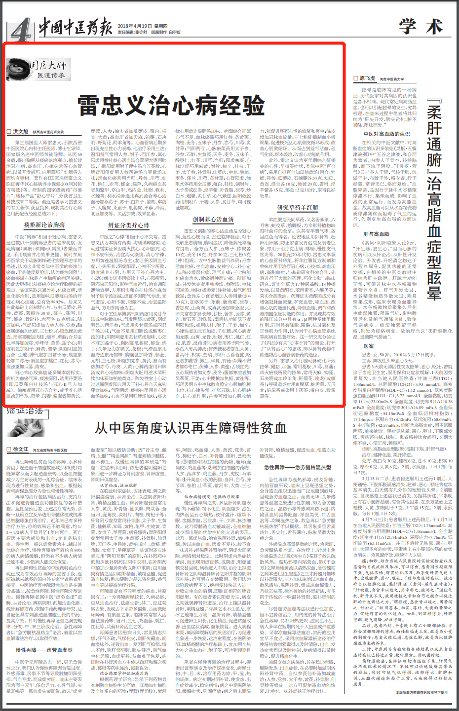 雷忠义创制的养心活血汤是为冠心病、急性心梗而设,经过临床验证,对于缓解患者胸痛、胸闷症状,降低病死率确有良效。全方由人参、五味子、陈皮各10克,麦冬18克,丹参30克,三七粉3克(冲)组成。方中生脉散益气养阴;丹参活血化瘀,生血凉血,安神宁心,补心定志;陈皮燥湿化痰,理气止痛;三七粉能化瘀血为水,散瘀消肿而定痛。